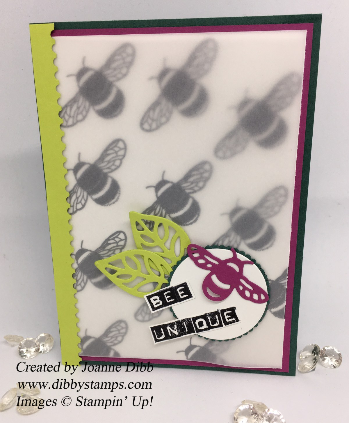After I had stamped out my black bee background it looked a little harsh against my Berry Burst matt and Tranquil Tide card base so I added a layer of vellum over the top.