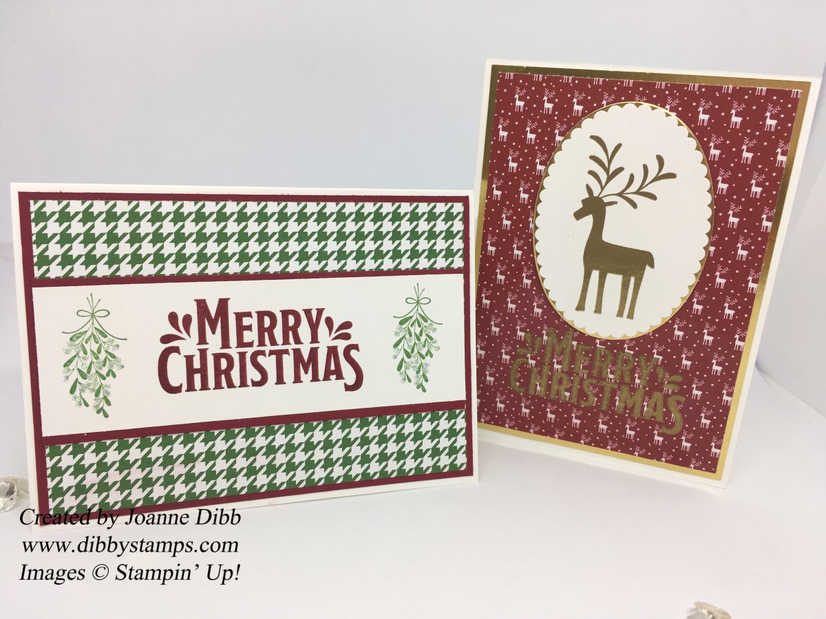 Today I’ve got two cards for the price of one with the duo made from the Merry Mistletoe stamp set and the Be Merry DSP. These products can both be found in the annual catalogue on page 113. Initially I overlooked Merry mistletoe but when it was in the sale last week I ordered myself a set and its growing on me. I love the Be Merry DSP mainly because I’m a real sucker for Cherry Cobbler, for me its the perfect Christmas red, but I also love how half of these papers contain generic patterns which can be used all year round. My favourite sheet though is still the cute little reindeer paper which I’ve used both sides of in todays projects.
