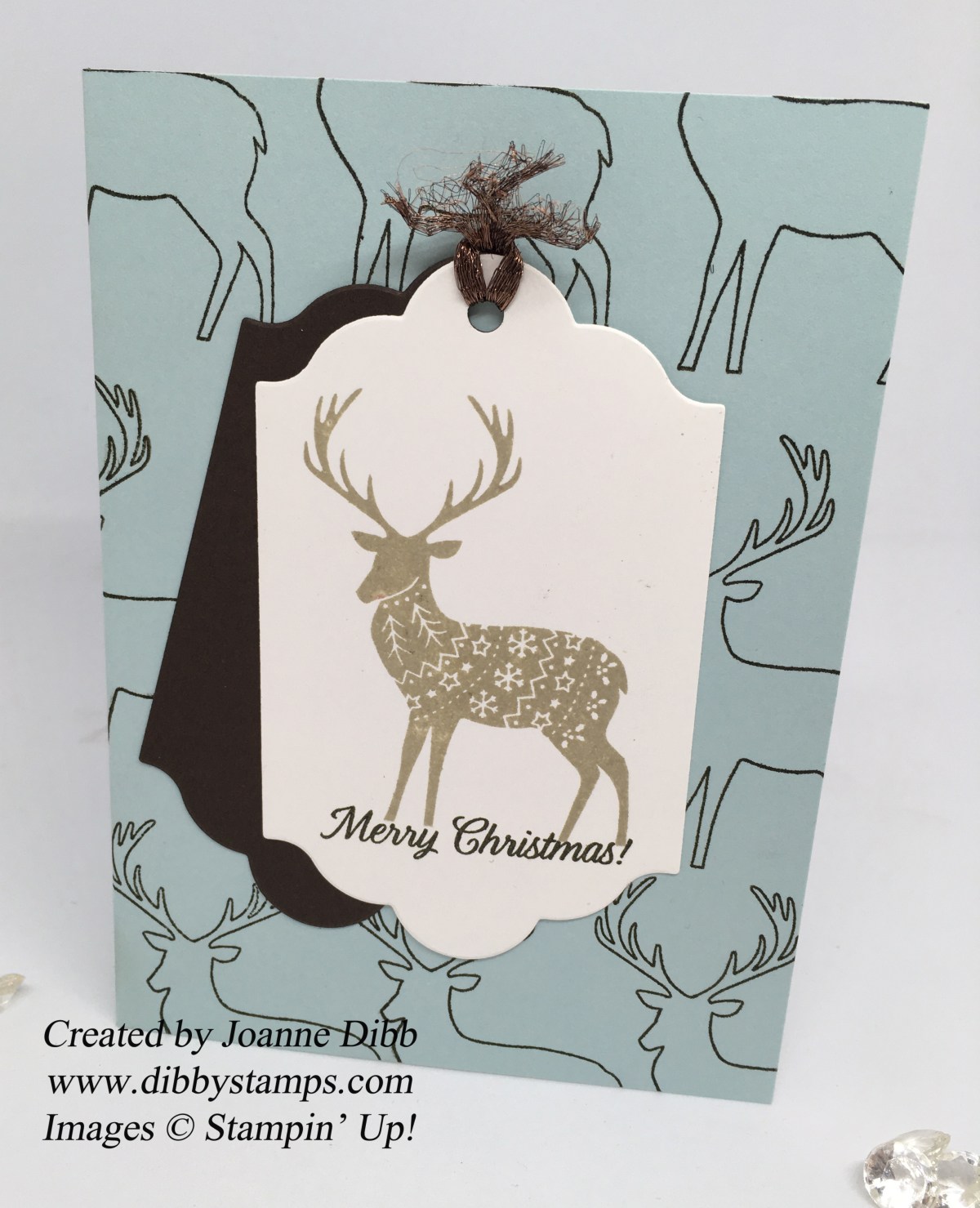 On a card base of Soft Sky I stamped the outline reindeer repeatedly in Early Expresso. I next cut out a label in Whisper White and Early Expresso from the second largest die in the Lots of Labels set. On the Whisper white one I stamped the patterned reindeer in Crumb Cake and the Merry Christmas at the bottom in Early Expresso.