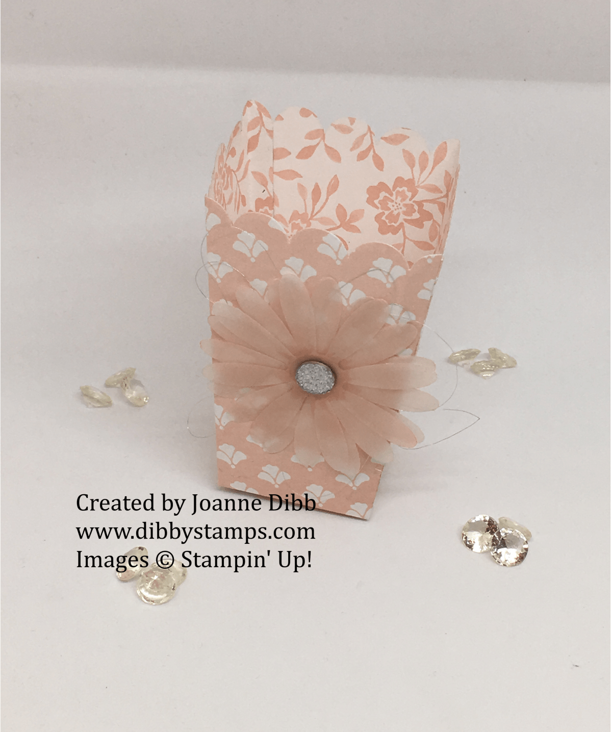 To embellish the front of the box I punched three daisies out of vellum and sponged them with powder pink ink before gluing together. I added a large faceted clear gem to the centre. I went round this gem with the powder pink Stampin’ Marker to added some more definition. To another bit of texture I added some loops of Silver Metallic Thread and secured behind the daisy.