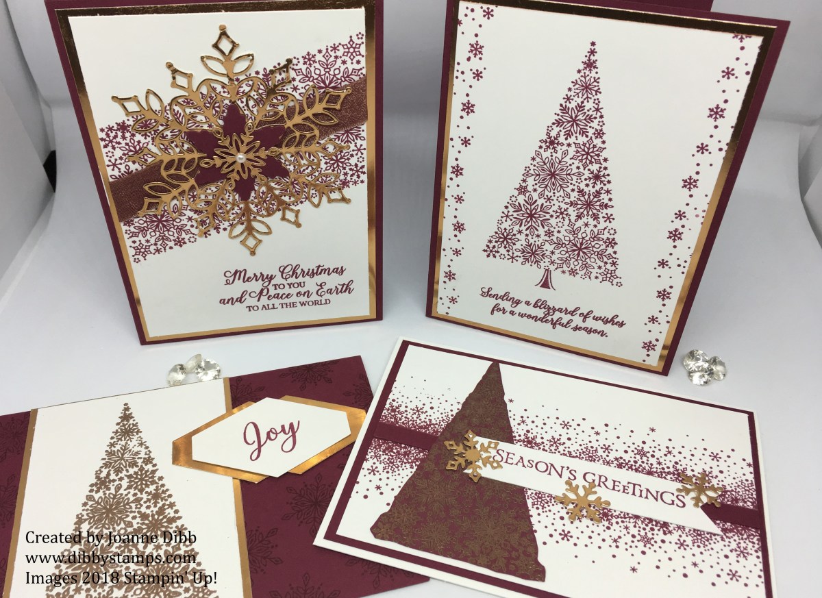 For the third card I embossed the tree again in Copper but this time I stamped it was on Merry Merlot cardstock, I then roughly cut the tree out. I created the background using the falling snowflakes stamp in two rows across the middle of the cardstock, with the Stamp-a-ratus this was easy it line up and looks great. I added a strip of Merry Merlot cardstock across the middle to ground the tree when I adhered it. To finish the card I added the greeting “Seasons Greeting” from the Beautiful Blizzard stamp set, which is another gorgeous snowflake set. As a final touch I added three copper snowflakes cut from the Snowfall Thinlits.