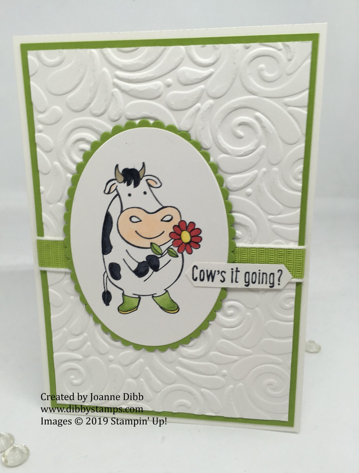 For the background I used the Swirls and Curls Embossing Folder, which you can see better in the first photograph. My cute little cow was coloured with Stampin’ Blends and then mounted on a scalloped oval in Granny Apple Green cut from the Layering Ovals dies.