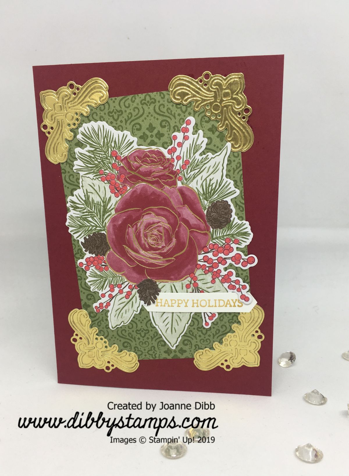 I added a little greeting from Itty Bitty Christmas. I stampe dit in Golden Glitz Delicata ink and punched it out with the Classic Label Punch. To fix it to the card I cut a little slit up near the pine cone so it could slot it among the foiliage and not detract too much from the goregous rose image.