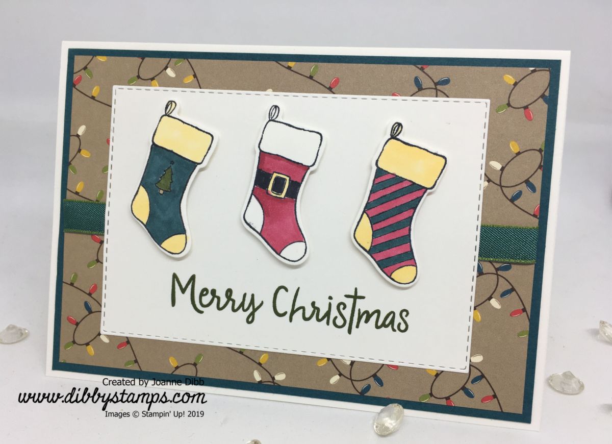 A strip of the Pretty Peacock/Old Olive Reversable Ribbon adds a little shimmer to the card and the “Merry Christmas” greeting stamped in Mossy Meadow from the Snowman Season stamp set finishes off the card.