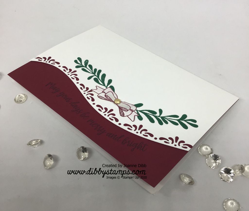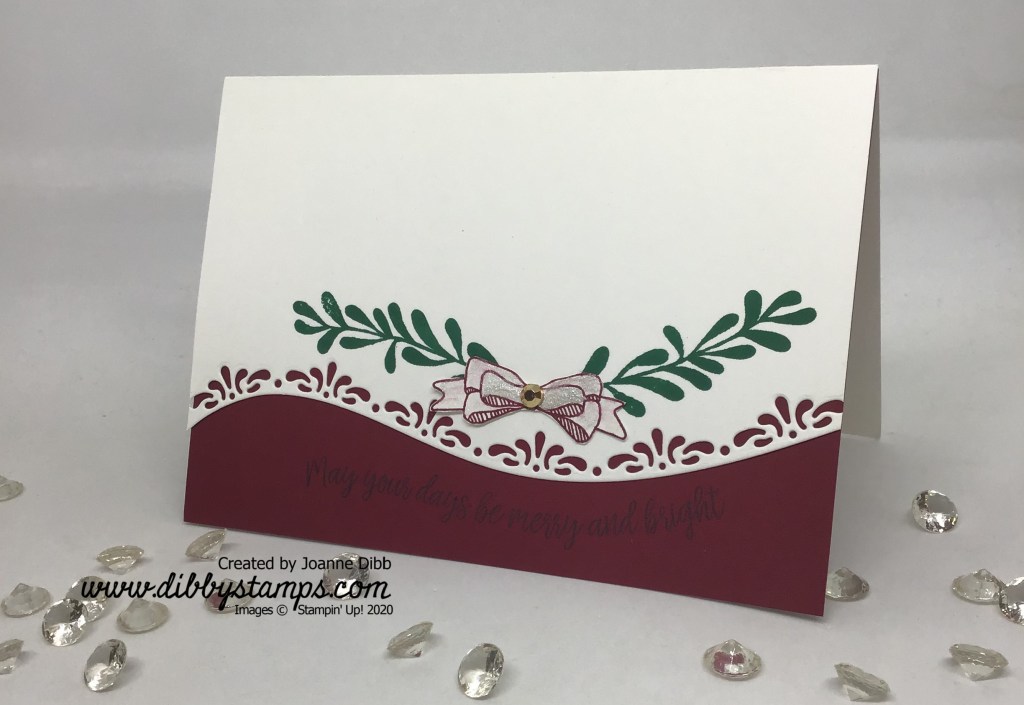I added the greeting “May your days be Merry and Bright” to the Cherry Cobbler cardstock at the bottom of the card and added some mistletoe sprigs in Shaded Spruce just abouve the filigree.