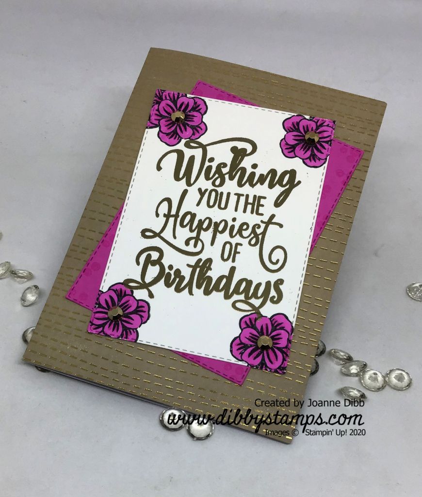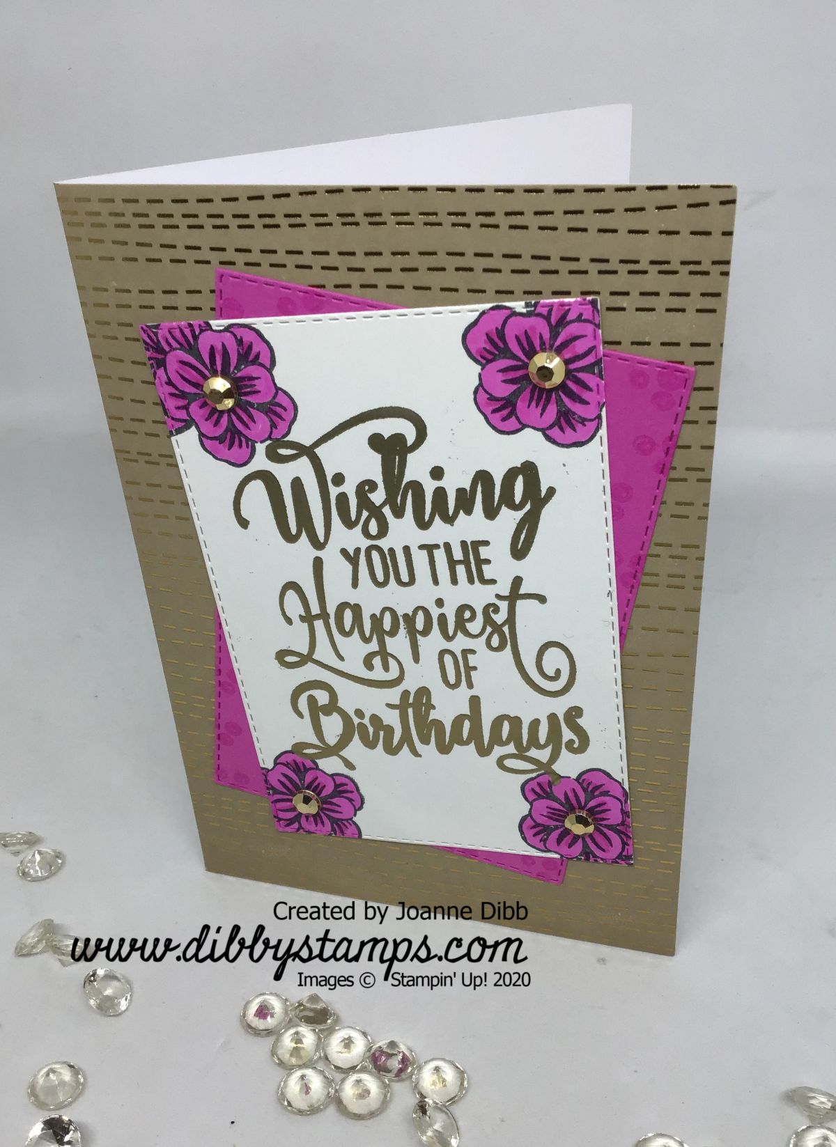 I’ve used the greeting “Wishing You The Happiest of Birthdays” as the focal point of the card. I stamped it on the second largest Stitched Rectangle die in Versamark and then embossed in Gold to match the card base.