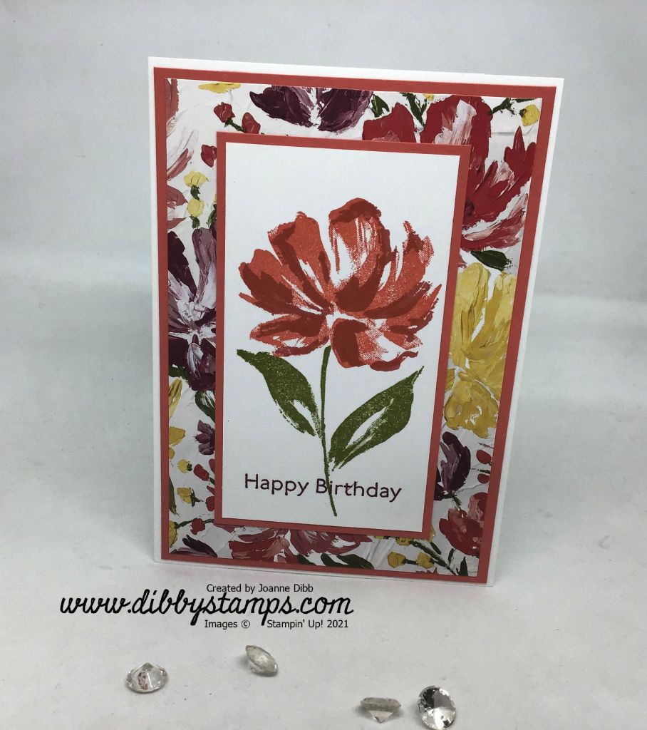 For the card I used the matching Art Gallery stamp set. The leaves were stamped in Old Olive and the flower was stamped in Calypso Coral and Terracotta Tile with the greeting stamped in Merry Merlot.